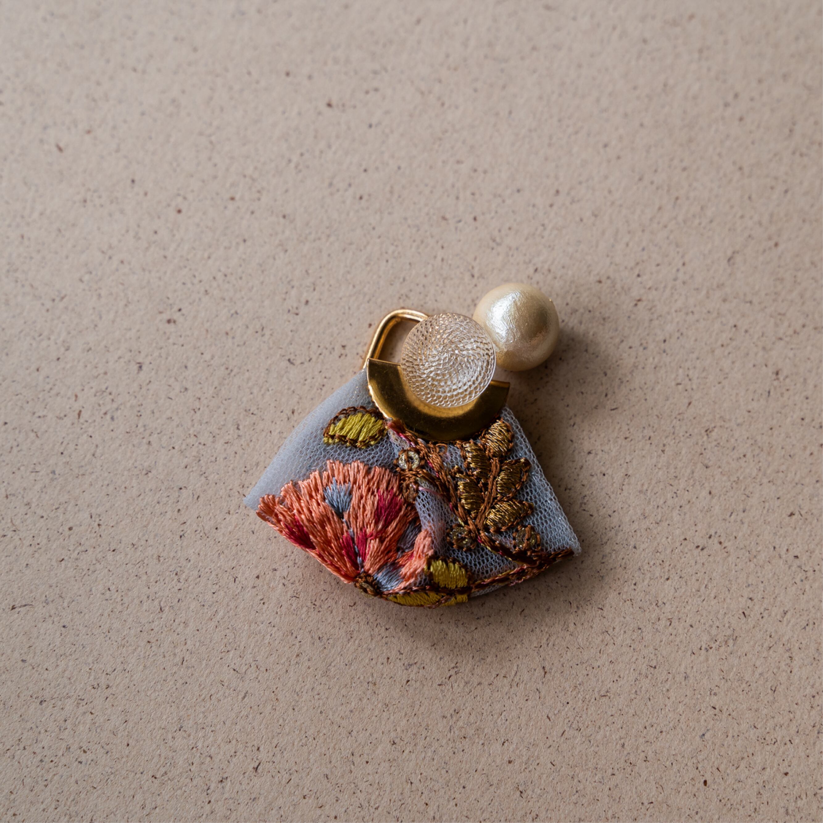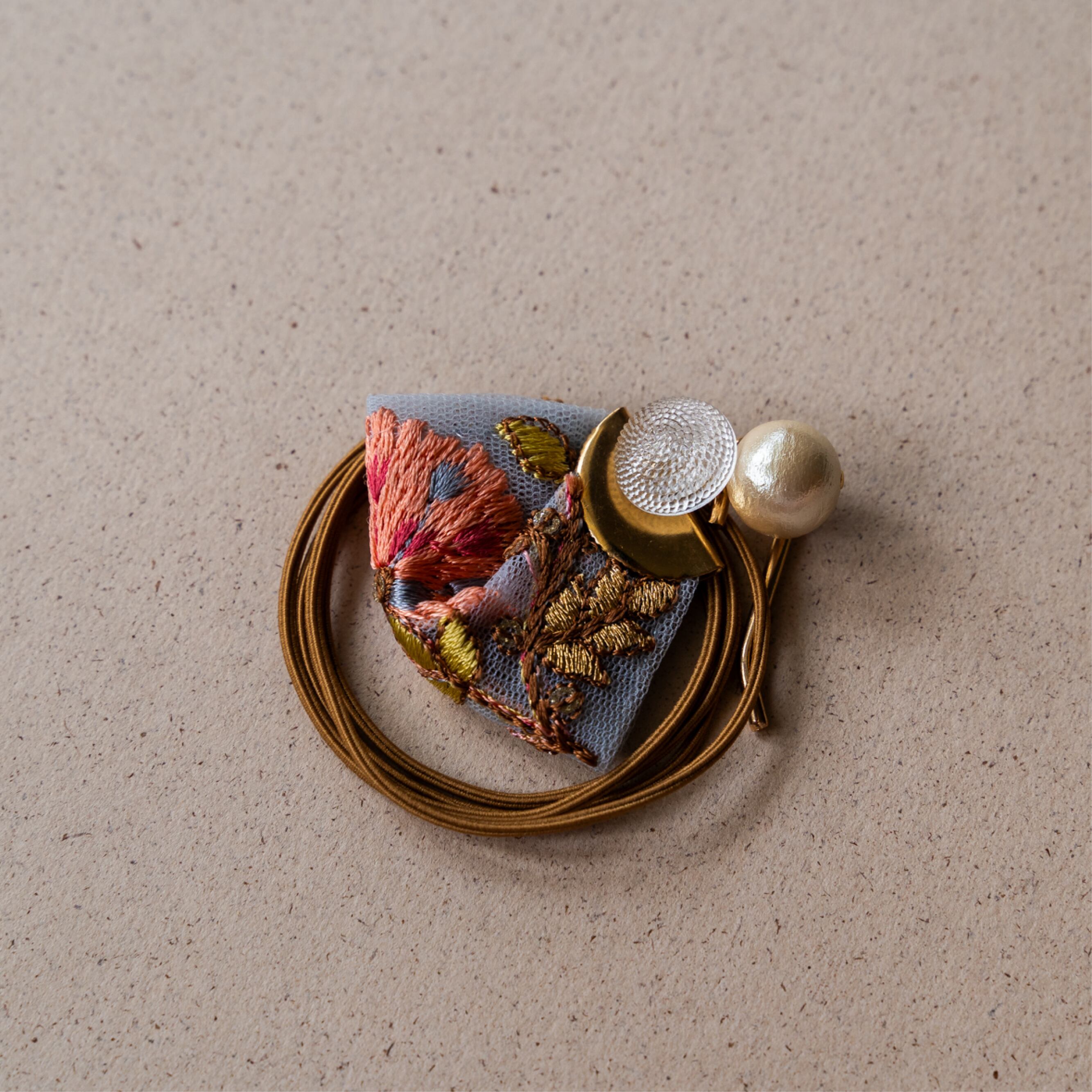 アンティークの刺繍パーツを使用した一点もののヘアゴムです。手作りの温かみが感じられるリボンと、緻密に縫い込まれた刺繍が、どこかレトロで女性らしい雰囲気を演出します。優しい調合いのリボンには、愛らしい花柄の刺繍が施されており、ヘアスタイルを華やかに彩ってくれます。どんなスタイルにも合わせやすく、日常使いから特別なシーンまで幅広く活躍してくれること間違いありません。
