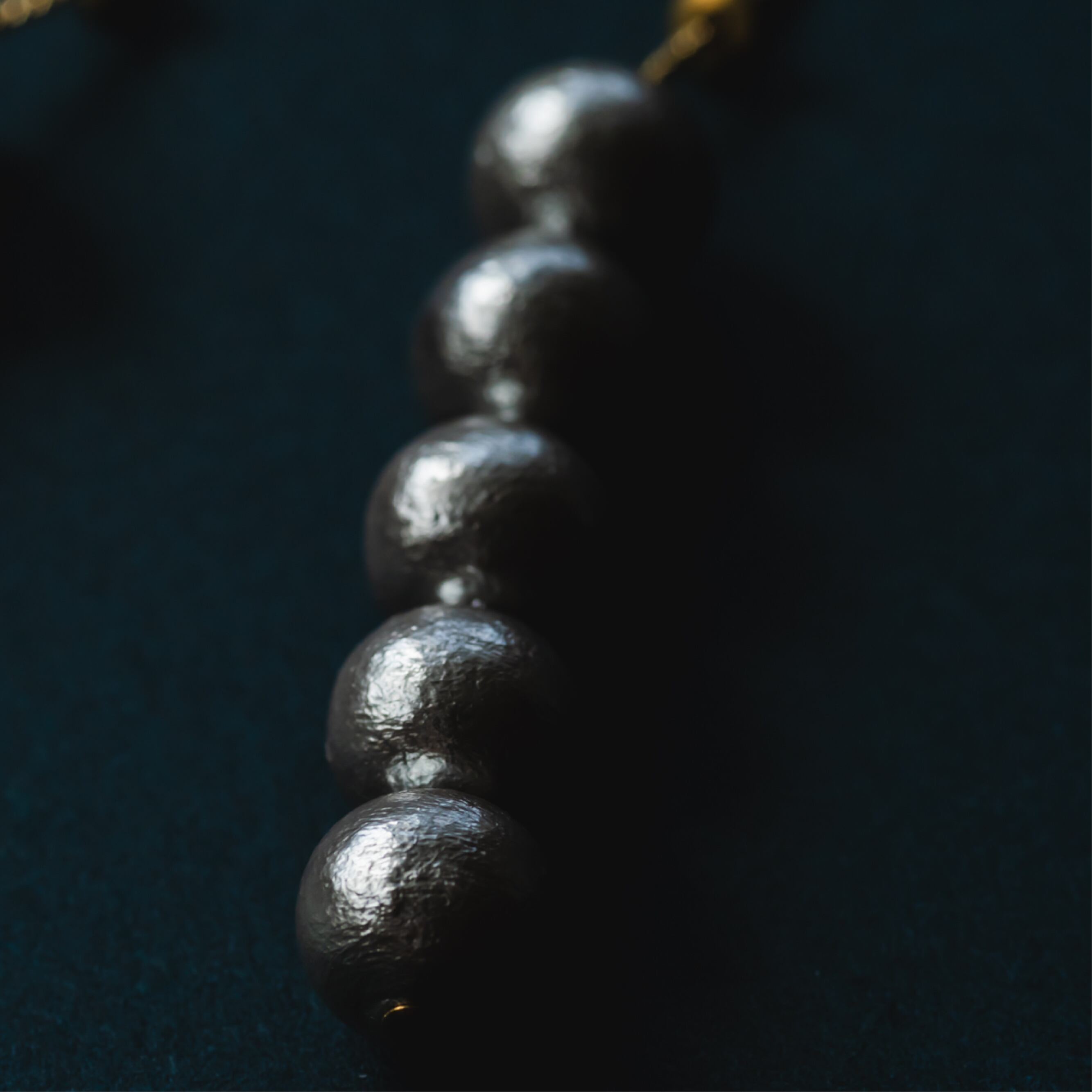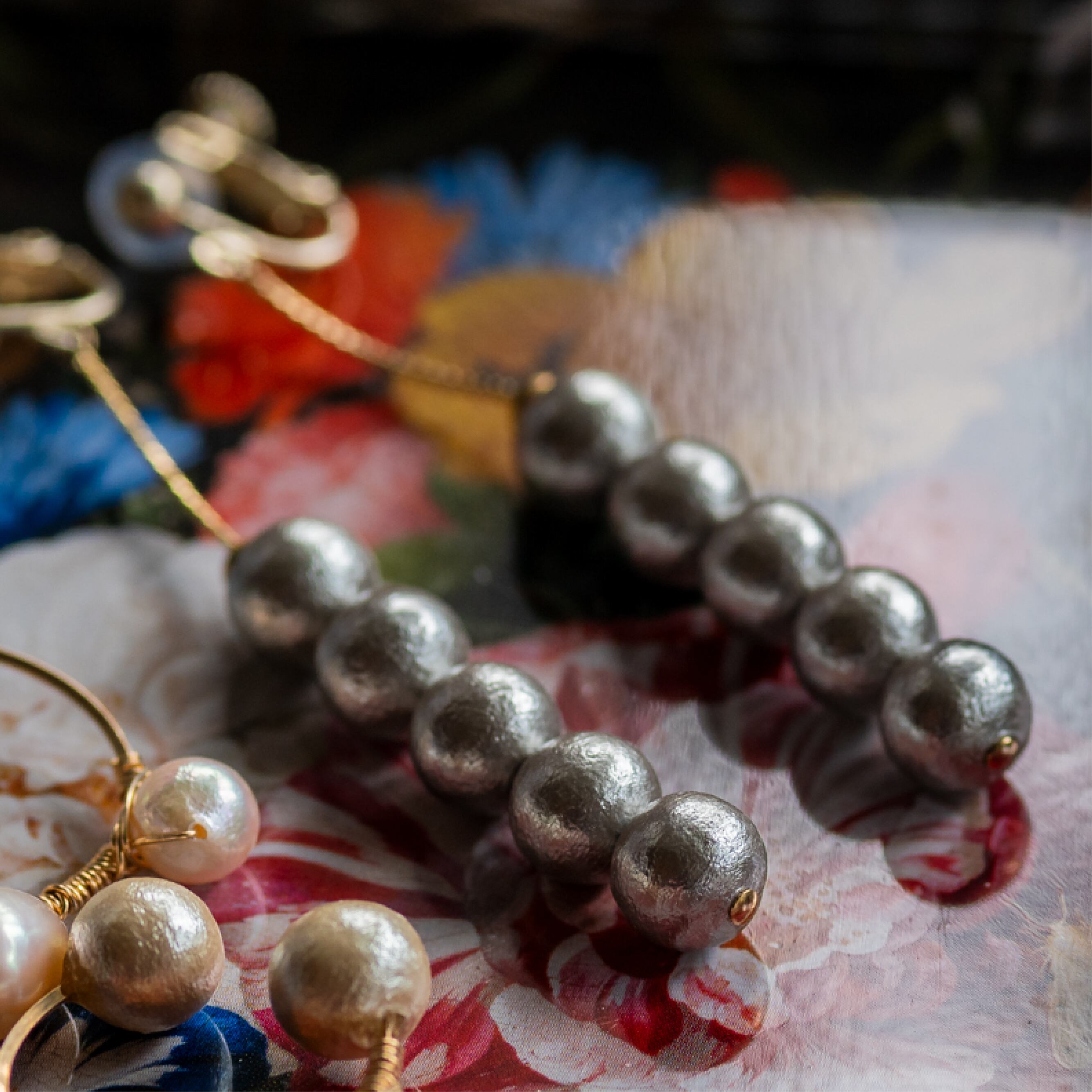 縦に連なるコットンパールが上品なアクセントになっています。お色はグレーとキスカ2色から。コットンパールの柔らかな光沢は、女性らしさを引き立て、着ける人の魅力をより一層引き出してくれることでしょう。
